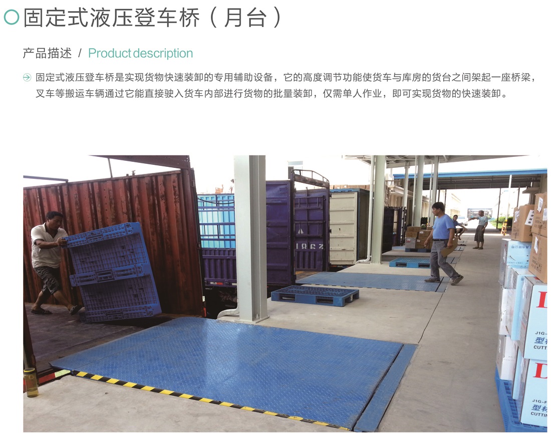 固定式液壓登車橋是實現貨物快速裝卸的專用輔助設備,它的高度調節功能使貨車與庫房的貨臺之間架起一座橋梁,叉車等搬運車輛通過它能直接駛入貨車內部進行貨物的批量裝卸,僅需單人作業,即可實現貨物的快速裝卸。